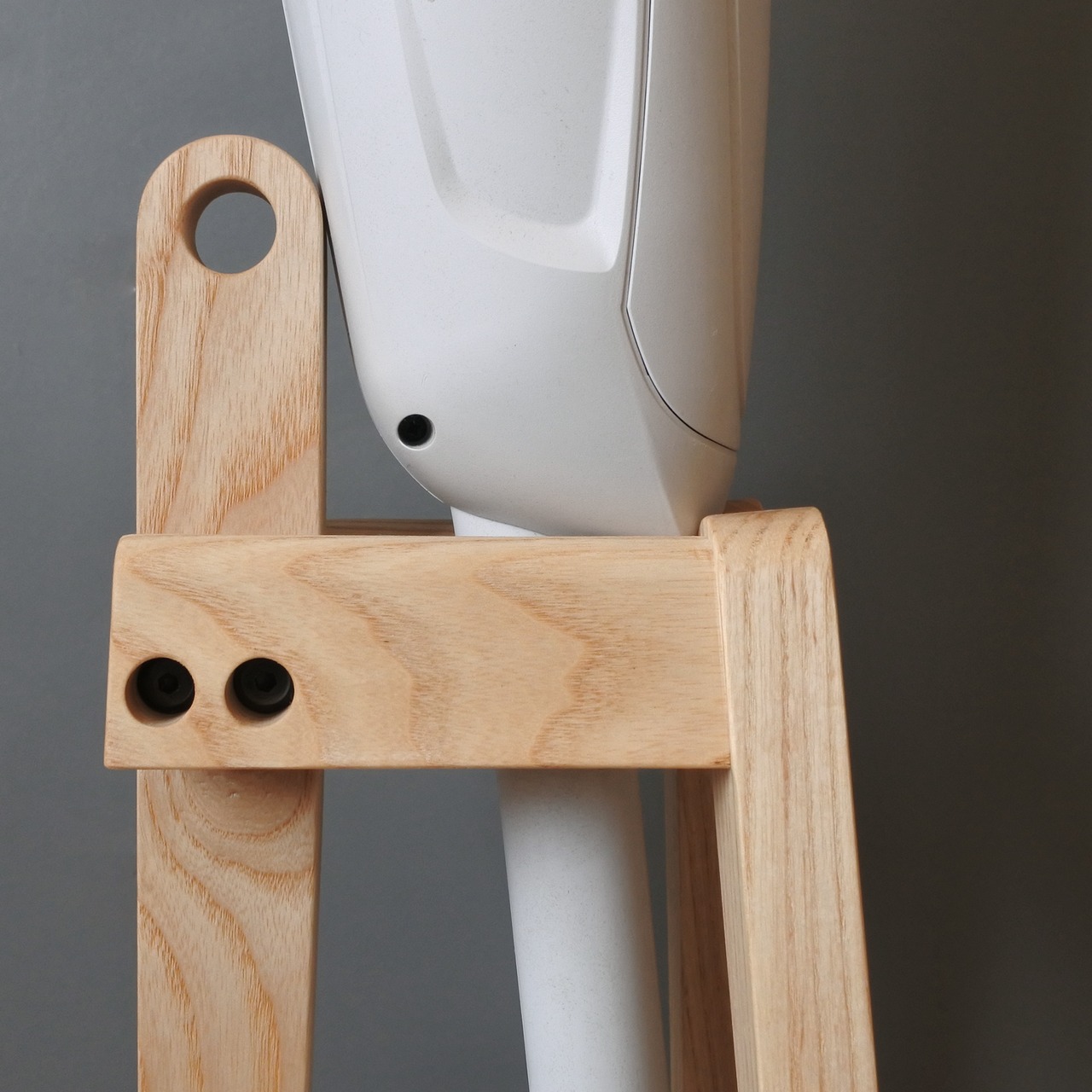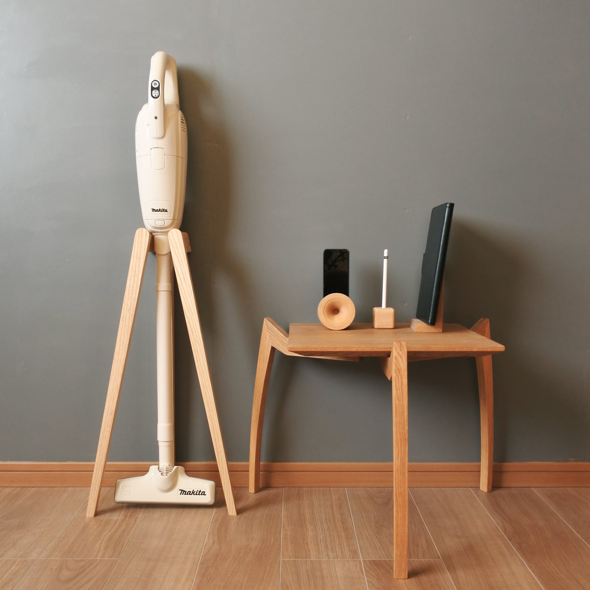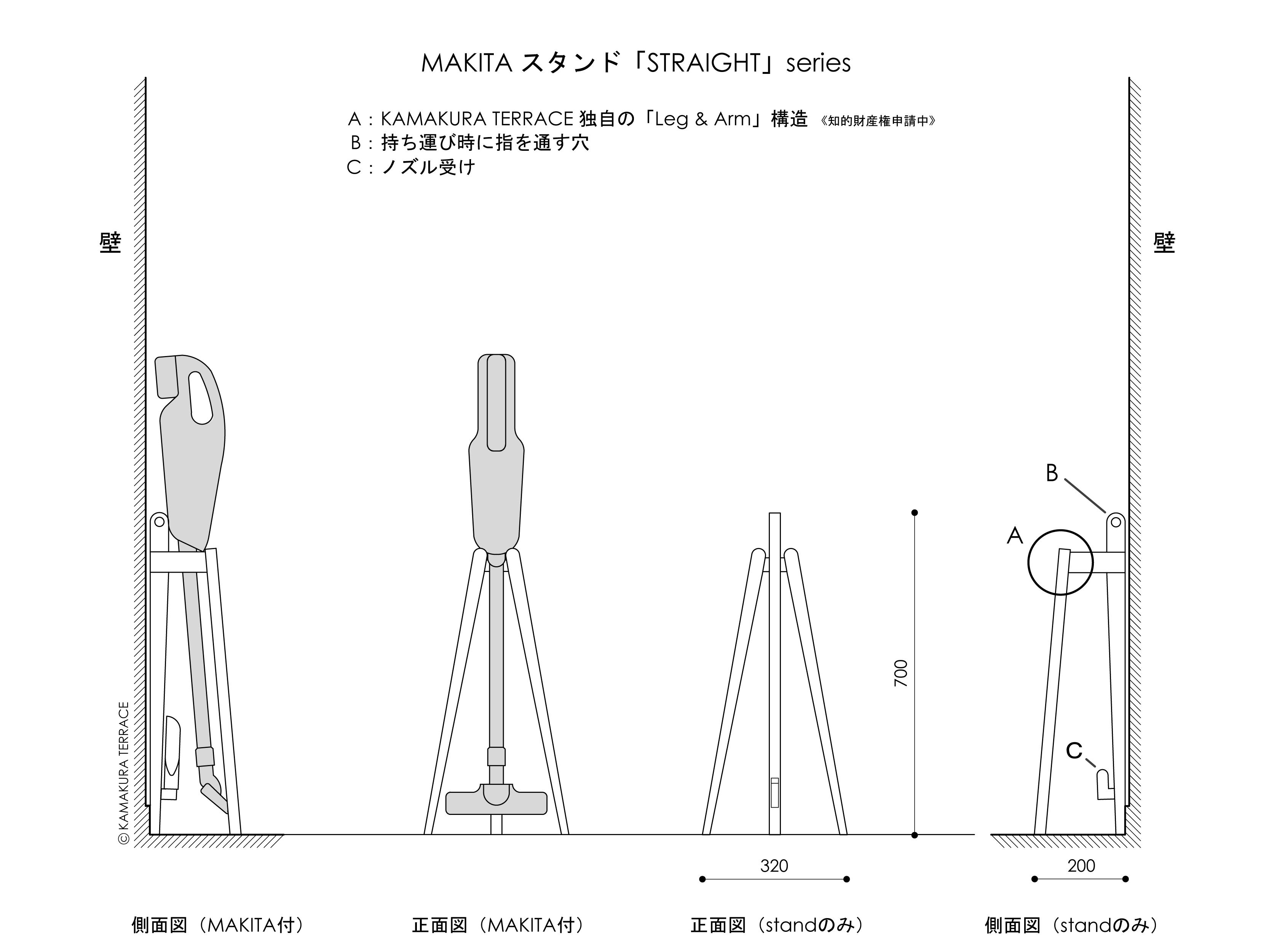 KAMAKURA TERRACE 独自「Leg & Arm」構造を採用 ≪知的財産権取得済≫、直結した2本の足とアームでスティッククリーナーを支えるためクリーナーのヘッドが床から浮いた状態になり清潔・スッキリ・省スペースでしっかりマキタ等のスティッククリーナーの保管が可能。サッと取れてサッと掛けやすく機能的。インテリアとしてクリーナーが保管されている状態を最も重要視しデザイン、見た目も大変拘り、どことなく愛嬌のある足は恰もクリーナー自体から生えていて今にも動き出しそうで空間全体を楽しく・スッキリ・明るく演出します。材質は KAMAKURA TERRACE ならではの木目が特徴的で綺麗な無垢の木材(高級グレードのみ)を使用。鎌倉の職人が1点ずつ丁寧に製作・全ての面で安心の「made in KAMAKURA JAPAN by KAMAKURA TERRACE」です。